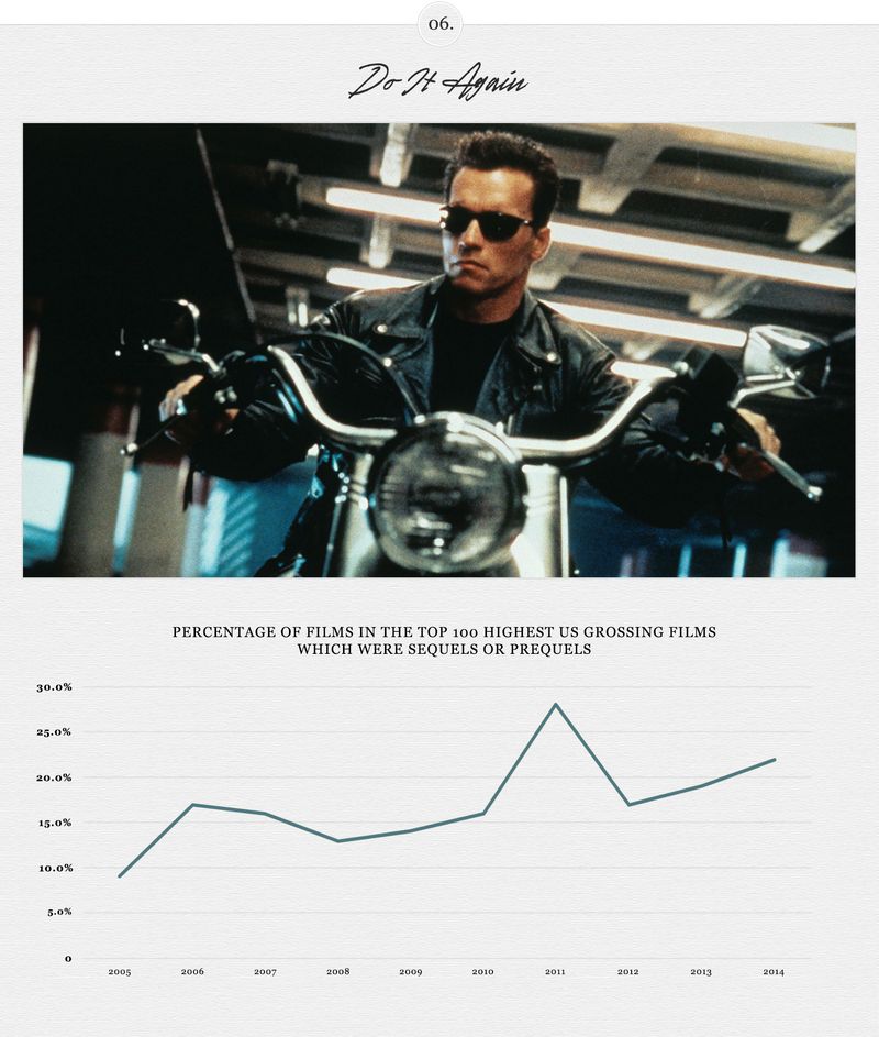 If after all your planning, producing, spending and marketing you actually have a hit on your hands… quick, do it again! In the past 10 years, the number of top grossing films that were actually sequels has more than doubled. In fact, sequels accounted for 14 out of the top 20 grossing films between 2013 and 2014.